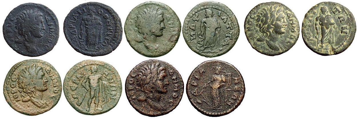 Zu dem Thema zeige ich gerne meine kleine Serie von fünf Münzen aus vier verschiedenen Städten, alle vom gleichen (Demos-)Vorderseitenstempel. Diese Verbindung wurde bereits durch Konrad Kraft erkannt, vgl. Kraft, Das System der kaiserzeitlichen Münzprägung in Kleinasien, Tf. 115, 13a-d.