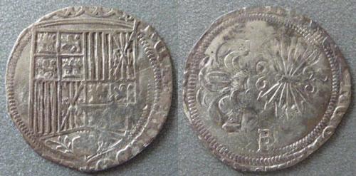 Obv.: FЄRnAnDUS: ЄT: hЄLIS[AB]ЄT , around a dotted circle containing a crowned shield of arms of Castilla-Leon, Aragon-Sicilia and Granada - alrededor de un círculo de puntos que contiene el escudo coronado con las armas de Castilla-León y Aragón-Sicilia, y Granada en punta.