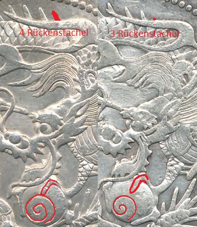 bei Typ 1 (der seltenere) läuft der 1. Drachenflügel zwischen dem 4. und 5. Rückenstachel aus. Der Haken an der Zählung ist folgender, es werden nur Rückenstachel gezählt die in etwa gleich lang sind. Dies wird meißt nicht beachtet!