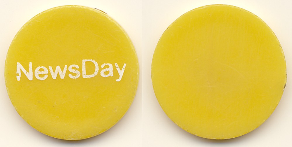 Daneben gibt es noch einen Typ gleicher Abmessung, der auf der Rückseite die Buchstaben ND für “NewsDay“ trägt. Zunächst hatte ich vermutet, daß der Aufdruck bei den Exemplaren mit blankem Rv einfach nur abgerieben ist. Aber bei allen Stücken des ersten Typs, die ich in den Fingern hielt, gab es keinerlei Spuren eines Aufdrucks auf der Rückseite.
