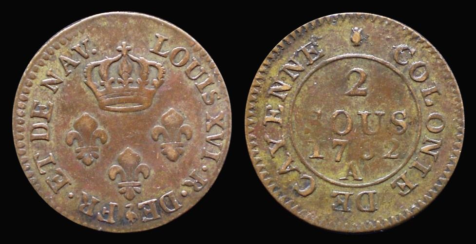 Der Vollständigkeit halber möchte ich hier noch ein Stück nachschieben, dessen Typ als Unterlage für den Gegenstempel gedient hat - ein 2 Sou Stück, geprägt für Cayenne.