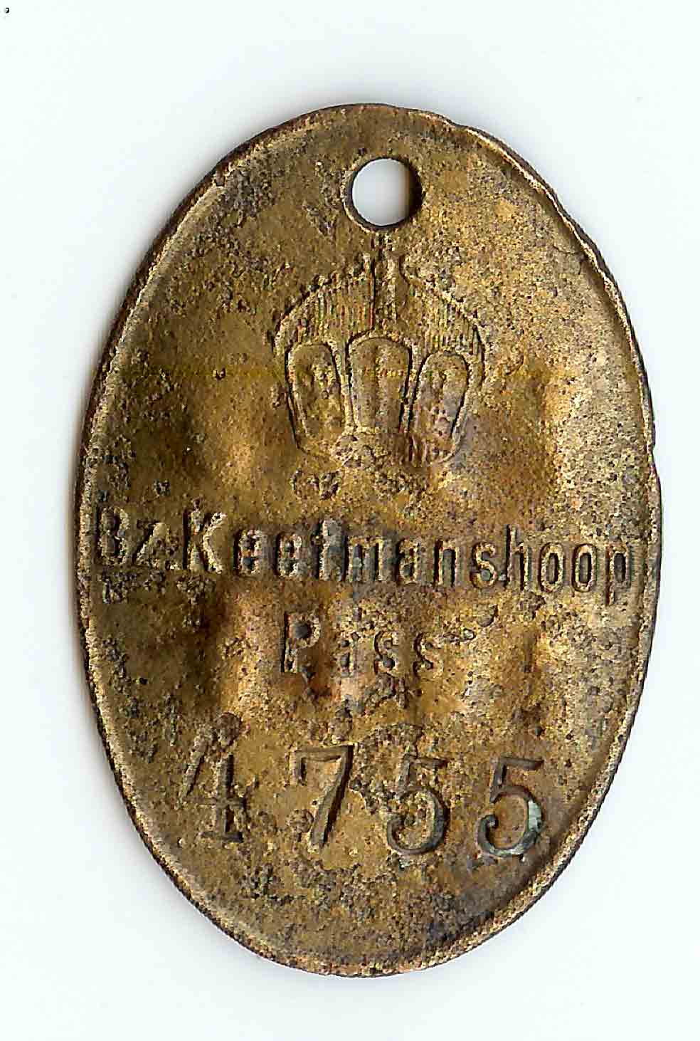 Hier eine weitere Marke von Keetmanshoop, bei der die alte dt. Nummer mit quergelegten Stahlnägeln ungültig gestanzt wurde.