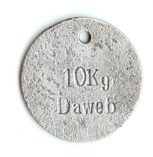 Aluminium, Durchmesser 34 mm, oben gelocht. Darauf vertieft "10 kg/Daweb". Gewicht 3,34 Gramm.