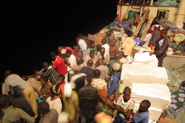 Dieses Schauspiel wiederholte sich nun im Rhythmus von 2 Stunden. Gegen 2 Uhr Nachts errichten wir unsere Station Mahale. Zum Ausbooten mussten wir mit unserem Gepäck in die dritte Klasse unter Deck, hier befanden sich die Ausgänge in den Bordwänden. Schon an der Treppe erwartete uns ein unglaubliches Gedränge. Es dauerte ein wenig bis wir uns bis auf 3 Meter an die Tür herangeschoben hatten. Ein Blick in den Passagierraum ließ ein Gefühl dafür aufkommen wie sich Sardinen in der Dose fühlen müssten. Noch war nicht klar mit welchem Boot wir übergesetzt werden sollten. Als ich nach einem Boot zum Mahale fragte meldeten sich sofort mehrere Bootsbesitzer, einer entriß mir gleich den Rucksack und versuchte sich durch den Gang zu seinem Boot durchzuschlagen. Als ich den Holzeinbaum sah, war mir klar das konnte nicht das richtige Boot sein. Ich nutze den Streit des Bootsführers mit einem Kollegen, der ebenfalls den Transportauftrag haben wollte und nahm den Rucksack wieder an mich. Ein anwesender Ranger des Parks erkannte wohl unsere Reiseabsicht und teilte uns mit dass das Boot der Parkverwaltung noch nicht da sei und wir noch warten sollten.