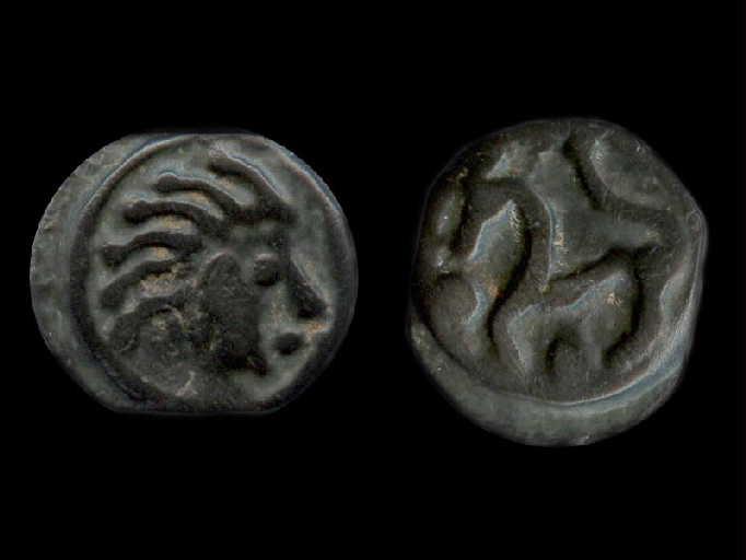 http://www.culture.gouv.fr/public/mistral/joconde_fr?ACTION=RETROUVER&FIELD_8=LOCA&VALUE_8=PERONNE&FIELD_10=APPL&VALUE_10=SENONES&NUMBER=3&GRP=0&REQ=%28%28PERONNE%29%20%3aLOCA%20%20ET%20%20%28%28SENONES%29%20%3aAPPL%20%29%29&USRNAME=nobody&USRPWD=4%24%2534P&SPEC=5&SYN=1&IMLY=&MAX1=1&MAX2=1&MAX3=100&DOM=Allzu 3) Potin-Münze der Cantii (Stamm im heutigen Kent, Südostengland); Van Arsdell 129-1