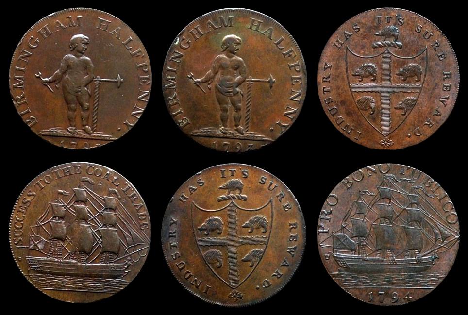 Left: Warwickshire, Halfpenny 1793. Boy holding spanner, BIRMINGHAM HALFPENNY 1793; Rv. A ship sailing r., SUCCESS TO THE COAL TRADE. Edge: PAYABLE IN LONDON. D&H 52
