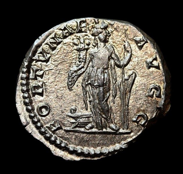 Septimius Severus AR Denarius. Obv: L SEPT SEV AVG IMP - XI PART MAX, laureate head right. Rev: FORTVNAE AVGG, Fortuna standing front with cornucopiae & rudder, prow at left. RSC 195. RIC 0126a. 3,17 g