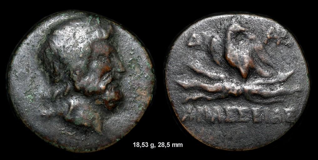 für diesen Typ bin ich auf der Suche nach einem Referenzstück weder bei Wildwinds noch bei Acsearch fündig geworden. Av. Zeuskopf rechts, Rv. Adler nach rechts schauend auf Blitz zwischen D - A, darunter AMASSEIAS? Als Stadt mit ähnlich lautendem Namen habe ich nur Amaseia in Pontus gefunden. Die metrischen Daten habe ich in das Bild eingefügt. Über eine Zuweisung würde ich mich freuen.