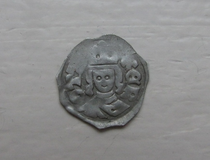 Du hast einen Wiener Pfennig aus der Zeit Ottokars II. von Böhmen (1251-1276). Er trägt neben der Königsbüste auch seinen Namen OTA-KER. Die Rückseite sollte das Wappen des Landschreibers Konrad von Tulln (1275-1276) zwischen 3 Sternchen zeigen.