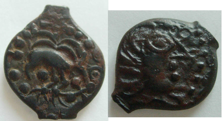 Du hast eine Bronze YLLYCCI à l’oiseau, classe XIa, der Senonen. Der Verkäufer hat recht: es handelt sich um eine Münze, deren Schrötling gegossen wurde (wohl ähnlich wie ein Potin zu mehreren an einem Strang, nach Abtrennen wurden die Gußzapfen nicht völlig entfernt). Dann wurde das Bild geprägt, es entstand nicht schon beim Guß.