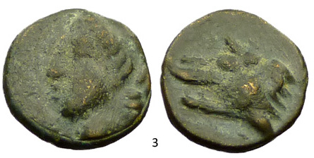 (I) agree with Alan Walker that the coin is more likely to belong to Asia Minor than to Argos. I say this not because I have seen any examples in Turkish museums (Fethiye, Afyon and Bolvadin museums are the only ones in which I have catalogued), but because (i) I have noticed such coins or similar on Ebay in accompaniment with other bronzes from north-west Asia Minor; (ii) the crown on the female head is similar to that on bronzes of Zeleia; and (iii) the head of a wolf (or is it a bear?) is similar to the lion-head on the lion-head/corn-grain bronzes of the Thracian Chersonese, and to the head of a wolf or dog on the obverse of a coin in my own collection, which has as reverse type a monogram (in an olive-wreath) easily resolvable as LY(simacheia). Not of course conclusive, but cumulatively suggestive.