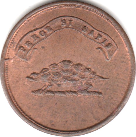 Eine Schildkröte, wohl als Symbol der Weisheit zeigt diese Marke einer heute nicht mehr bestehenden "Uxbridge School". Das ist heute ein Stadtteil Londons, damals war es ein Marktflecken auf dem Weg nach Oxford. Das Stück ist vor 1865 entstanden (schon bei Neumann katalogisiert), es gibt mehrere Varianten davon. Vermutlich war es eine Prämienmarke. Es gibt Exemplare, in die der Name eines Händlers eingepunzt ist. Womöglich hat er nach dem Ende der Schule den Tokenbestand übernommen und als Farthingtoken weitergenutzt. Bell katalogisiert das Stück als Farthingtoken, Nr. 4960. Grüße, KarlAntonMartini