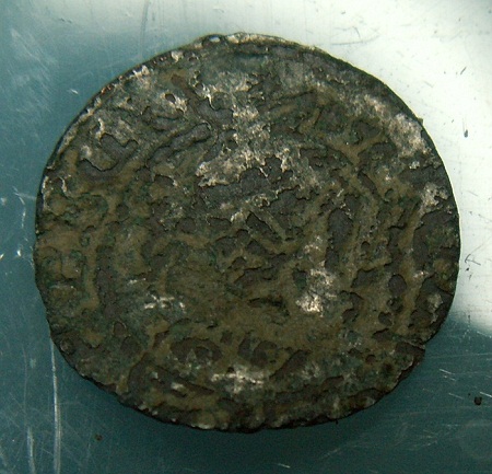 Ich glaube links vom Wappen gegen den Uhrzeigersinn lesen zu können "NOD DG", oberhalb des Wappens dürfte eine Jahreszahl stehen, die ich aber nicht lesen kann. Ebenfalls 14mm, Gewicht 0,25g.
