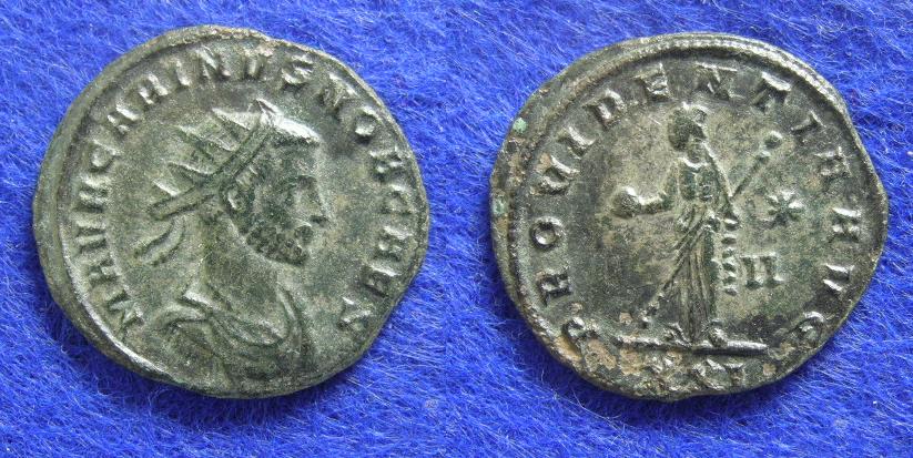 Carus aus Ticinum Carus mit K geschrieben, RIC 77c, mir sind 12 Exemplare bekannt.