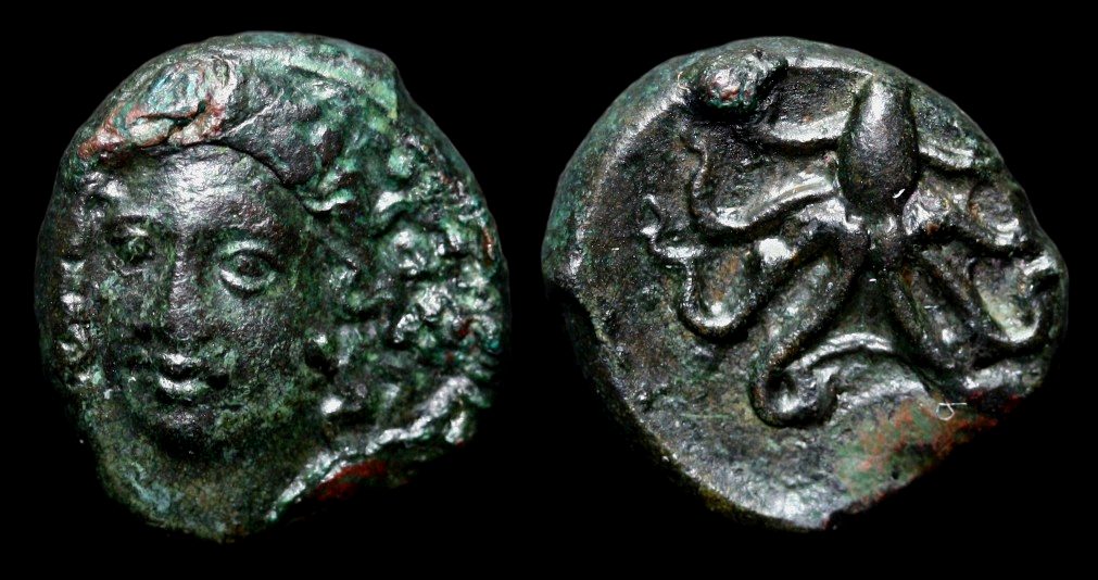 Die folgende Münze wird datiert in die Zeit des Niedergangs der Stadt. 214 - 212 BC belagert, wurde Syracus von den Römern erobert. Während der Kämpfe innerhalb der Stadt wurde Archimedes entgegen der Weisung des römischen Feldherrn von einem römischen Soldaten an seinem Arbeitsplatz erschlagen. Die Festung konnte sich noch monatelang halten, ehe sie durch Verrat fiel. Ein iberischer Hauptmann ließ das Tor an den Quellen der Arethusa öffnen.