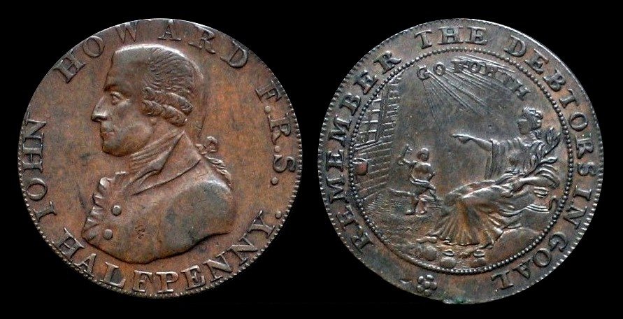 Einen dieser anonymen Token kann ich beisteuern. Die "Gaol"-Szene ist gleich geblieben, aber auf der anderen Seite hat der Philanthrop John Howard seinen Platz gefunden. Zugewiesen habe ich das Stück als Somersetshire, Bath Halfpenny (undated), Edge: PAYABLE AT LONDON OR DUBLIN, D&H 36. Das Portrait von Howard ist übrigens auch auf regulären Token verwendet worden.