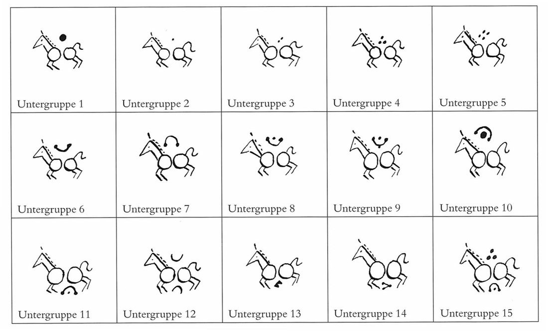 Untergruppe 15: Drei Punkte über dem Pferd, unter dem Pferd nach unten offener Torques mit Punkt.