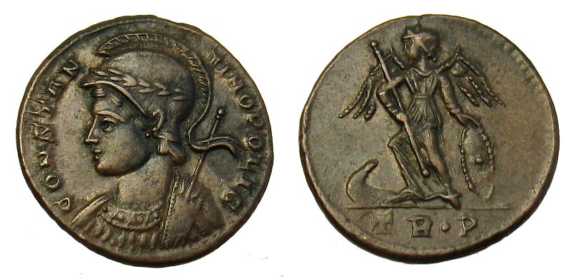 Av.: CONSTAN – TINOPOLIS; behelmte Büste im imperialen Mantel n. li. In der Rechten umgedrehter Speer.