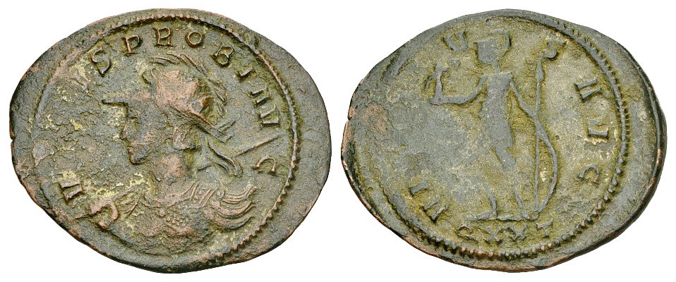 VIRTVS PROBI AVG laureate, helmeted and cuirassed bust left, holding Victory in right hand, shield on left arm, spear over shoulder