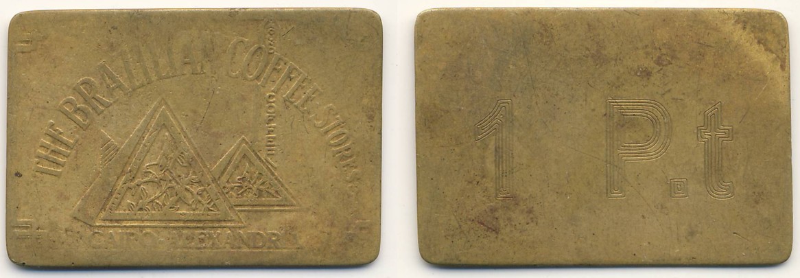 Ein interessanter Token aus Ägypten ist das Stück zu 1 P.t (Piastre) der Firmenkette (Ja, so etwas gab es schon vor McVomits!) "The Brazilian Coffee Stores" in Cairo and Alexandria.