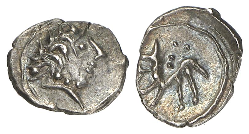 AR-Obol, 3./2. Jahrhundert v. Chr.; 0,78 g. Frauenkopf r.//Gehörnter Vierfüßer l., darüber vier Punkte. BMC vergl. 33 ff.