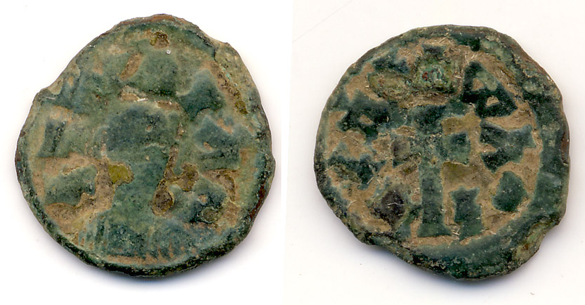 Meine aus Axum mitgebrachten, mit schöner Sandpatina versehenen Stücke, werde ich doch nicht abschrubben oder ins Ultraschallbad legen. Dazu sind sie mir viel zu schade. Einmal habe ich tatsächlich eine recht gängige Axum-Münze ins Untraschallbecken gelegt. Die Sandpatina war verschwunden. Was zum Vorschein kam, war ein mit Pseudo-Malachit (einem bestimmten Kupferphosphat) überzogenes Stück. Leider habe ich kein Bild von vorher-nacher. Ein Lapsus meinerseits, der bitte zu entschuldigen ist. Vielleicht wiederhole ich es einmal mit einer andern "gängigen" Axum-Munze. Aber was ist bei Axum schon gängig? Das sind alles Individuen! Das Nachher-Bild des in Rede stehenden wirklich sehr schlecht erhaltenen anonymen Stücks - von der Sandpatina beraubt - seht Ihr hier (Anonymous, MH#76; H#36):