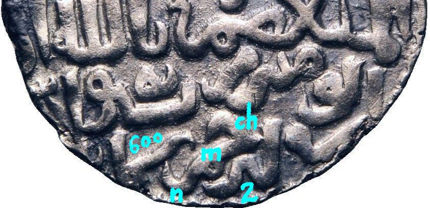 "emir al muminyn" (Beherrscher der Gläubigen) habe ich wegen der außergewöhnlich guten Lesbarkeit erneut markiert. Da für den Wortteil "m(n)yn" oftmals erst zu Beginn der nächsten Zeile (also ganz rechts) ausreichend Platz ist - das betrifft v. a. die Münzen der "Drei Brüder" -, kann er leicht für einen Teil der "Prägeformel" gehalten werden.