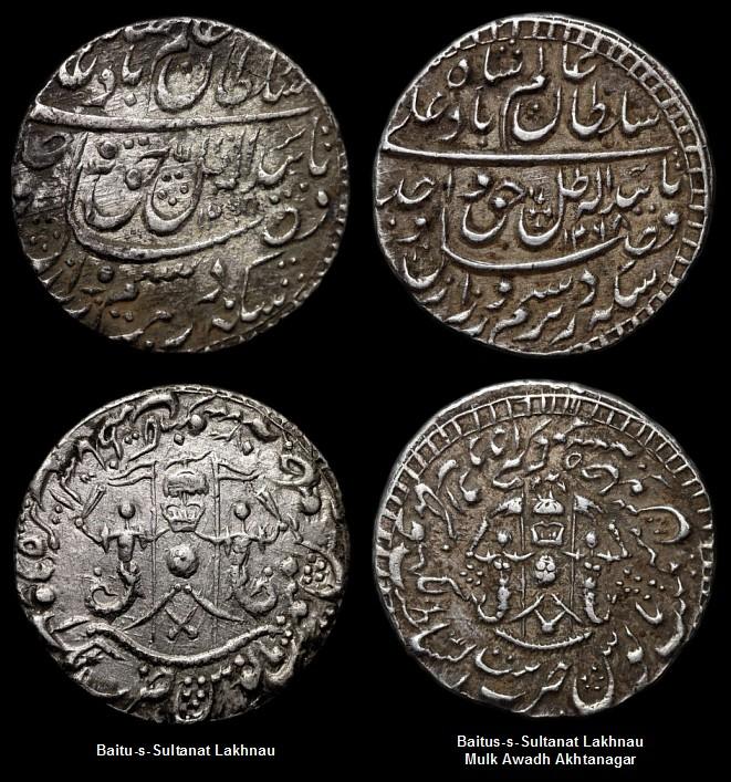 Krönungsmedaille wurde geschlagen - ein Brauch, der in Indien eigentlich eher unüblich war. Europäisch orientierte Heraldik wurde auch für das Münzdesign des neuen Königreichs konzipiert. Allerdings wurde das Design von zwei Hindus ausgeführt, die in der Münze von Lakhnau beschäftigt waren, wodurch diese Münzen ihr eigenes Gesicht bekommen haben. Zum besseren Vergleich stelle ich die traditionelle anonyme Version der Awadh-Rupie mit Fisch und Fahne, die noch unter Haidar Ali als Nawab geprägt wurde, neben die Ausgaben nach der Krönung. Alle drei Typen wurden in Lucknow geprägt, unterscheiden sich jedoch durch die Münznamen im Revers.