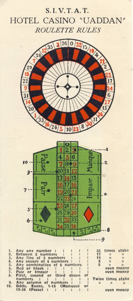 Das dritte Bild zeigt die Regelkarte des Roulettespiels dort. Sie wurde von "Poligrafico Maggi - Tripoli" gedruckt und stammt aus dem Nachlass vom US-amerikanischen Major General Bernard L. Robinson, der meines Wissens jedoch nicht in Libyen stationiert war.