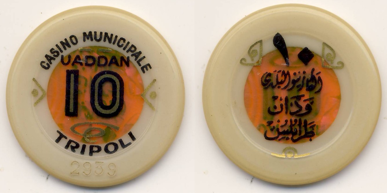 In Tripoli in Libyen lag das Casino Uaddan. Es gibt eine ältere Serie mit Jetons, die nur Italienisch als Sprache aufweist (Casino Uaddan - Tripoli d'Africa) und sehr selten ist. Der folgende Jeton kommt aus einer späteren Serie, die Arabisch und Italienisch beschriftet ist. Auch dieser Jeton ist schon schwierig genug zu finden.