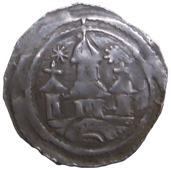 der sog. Dreiturmpfennig (mit der Hand) kam in Oberteisendorf in 466 Exemplaren vor mit ca. 20 Vorder- und 20 Rückseiten-Varianten vor ("alle Exemplare sind gut erhalten").
