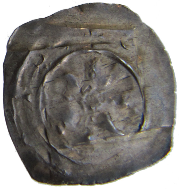 Hier zunächst ein Kärntner Brakteat, der quadratische Schrötling ist durch Vierschlag bearbeitet und an den Ecken etwas gestaucht, um den Pfennig etwas runder zu machen.
