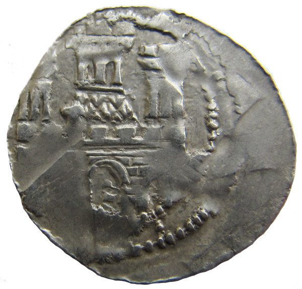 Die Rückseite zeigt eine Zinnenmauer mit Torbogen. Darüber ein dreiteiliges Gebäude. In der Mitte ein Gebäude mit Dach, darüber aber diesmal ein Zinnenturm, beiderseits flankiert mit zwei weiteren Wehrtürmen.