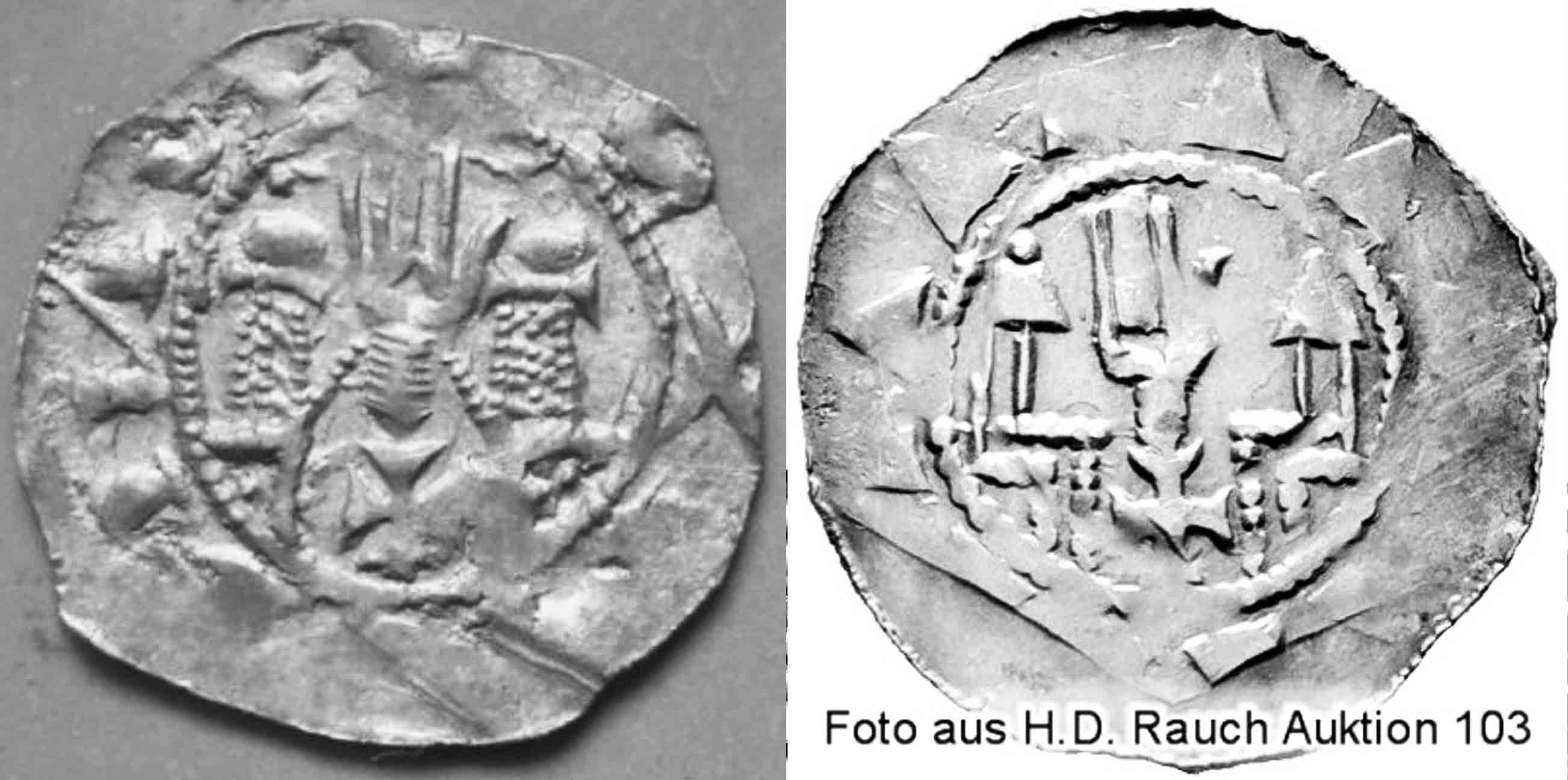 Es gab zu dieser Zeit auch in Bayern (z.B. Regensburg) Dünnpfennige, die jenen aus Neunkirchen sehr ähnlich waren. Manche zeigen sogar in Teilen identische Prägebilder. Das betrifft aber eher spätere Stücke der Typen ab B 35.