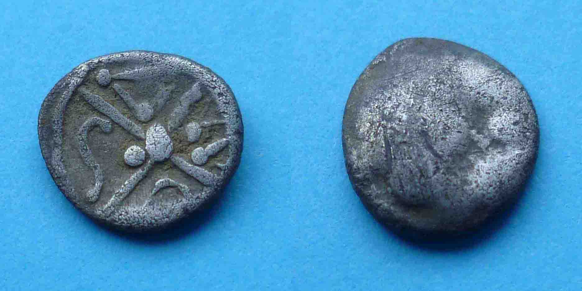 Münze 2: Obol Typ Dühren? Verwilderter Kopf, nur noch Buckel?