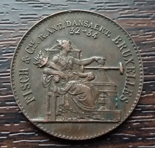 Werbemarke der Firma Fisch & Cie aus Brüssel, Hersteller von Matrizen, Orden, Medaillen, Knöpfen, Plaketten, u.s.w. ………