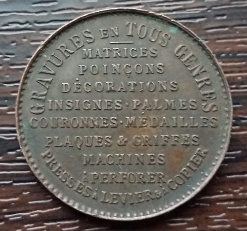 Auf der Vorderseite: Fortuna sitzend vor einer Spindelpresse, in der Umschrift die Firmenadresse