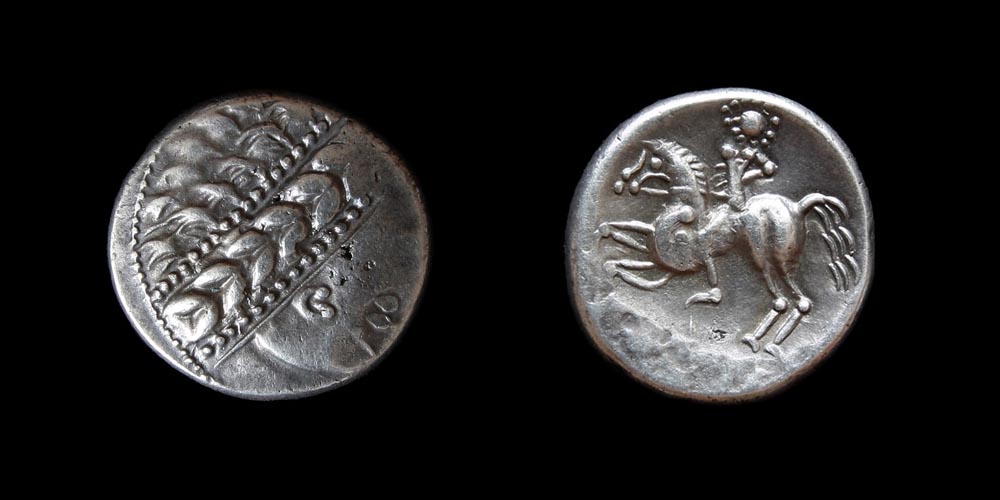 Av: Kopf rechts mit Lorbeerkranz, mandelförmigem Auge mit Zentralpunkt und kleinem Torquesohr.