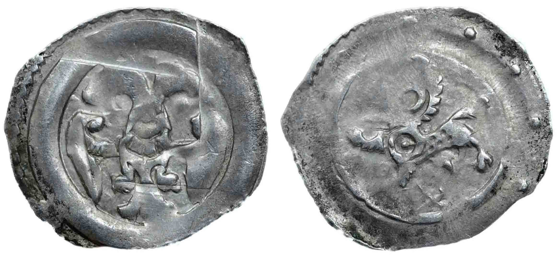Ich vermute den Vierschlagpfennig der Ente von Ottokar II... was aber eher geraten ist. Zumindest vermute ich einen Vogel und eine einseitige Prägung?!