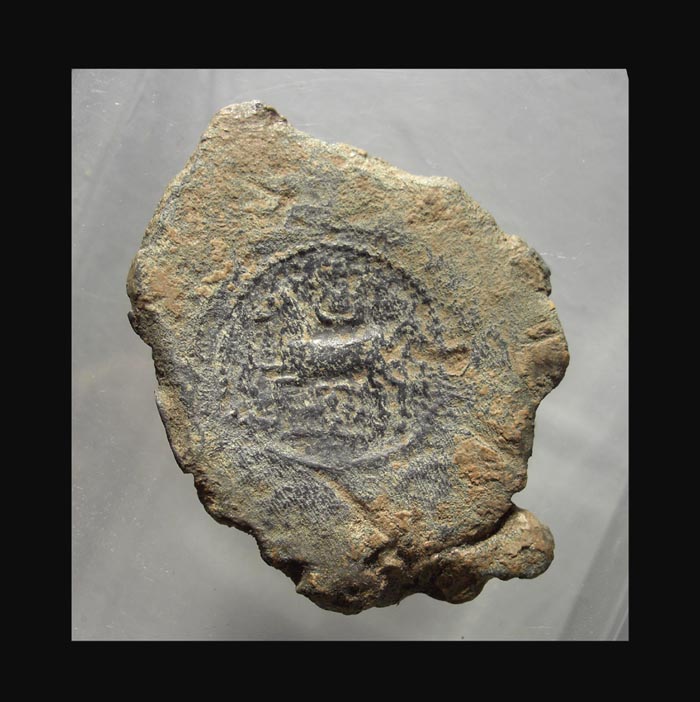 Es handelt sich um die Bleiprobe eines Reversstempels vom Typ Apollokopf- Leierblume.