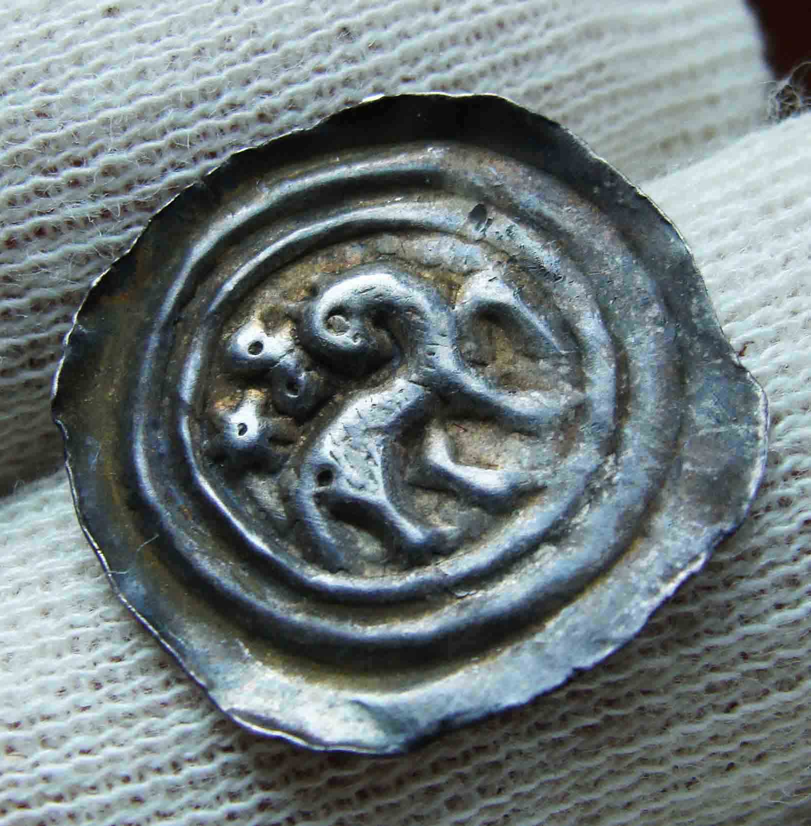 hier ein stempelgleiches Stück C c 28 c mit 4 (!) Punkten. Nur die beiden unteren Punkte sind auf dem Bild als schwache Ausbuchtungen zu erkennen, die beiden oberen kann man nur, wenn man den Brakteaten hin und her dreht, unter der Lupe ahnen. Ich habe die Münze früher für eine 3-Punkt-Variante gehalten. Bei Deinem Stück schaut es auch so aus. Ich glaube nicht, daß die (vertieften) Punkte der Beizeichen durch Metallabrieb auf dem Prägestempel verklebt sind (soetwas kann vorkommen), oder daß der Prägestempel zufälligerweise genau an der Stelle der Punkte eine Metallschwäche aufweist, sondern man hat eher den Eindruck, als wollte man die Punkte aushämmern, so daß dort jetzt eine Art Wulst zu sehen ist.
