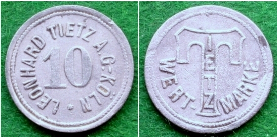 3 - Zink - 23 mm Durchmesser - 2,9 g - glatter Rand Av. Wertziffer 10. Umschrift LEONHARD TIETZ A.G.-KÖLN • Rv. Tietz-Emblem: Großes T, darin senkrecht IETZ. Umschrift WERT - MARKE Kataloge: Menzel 1997.4, Hasselmann 507.4, Funck 483.4