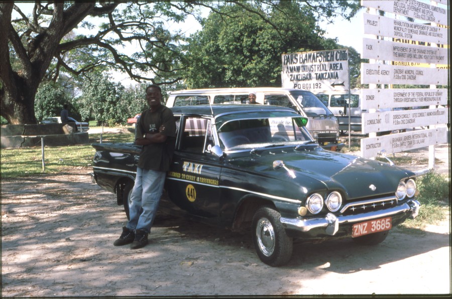 Jetzt zu den Bildern. Die ersten vier stammen vom Besuch 1998. Erstens ein 08/15-Bild vom Strand bei Stone Town. Links ist ein im Bau befindliches Fischerboot zu erkennen. Auf dem zweiten Bild eine Ansicht des Stadtteils Malindi, ganz in der Nähe zum Zentrum. In Stone Town selber ist es aufgrund der Enge der Gassen schwer möglich, Fotos zu machen. Das dritte Bild zeigt eine der typischen, aufwändig gestalteten Holztüren der Häuser in Stone Town. Entschuldigt bitte Bild 4 - da kann ich mich als Oldtimer-Fahrer nicht zurückhalten. Wir sehen dort einen alten Ford Consul Classic als Taxi. Das Vehikel hatte ich am ersten Tag entdeckt und vollkommen begeistert samt Fahrer für ein paar Tage zum Erkunden der Insel angemietet. Dieser Fahrzeugtyp wurde in GB nur recht kurze Zeit von 1961-63 gebaut:
