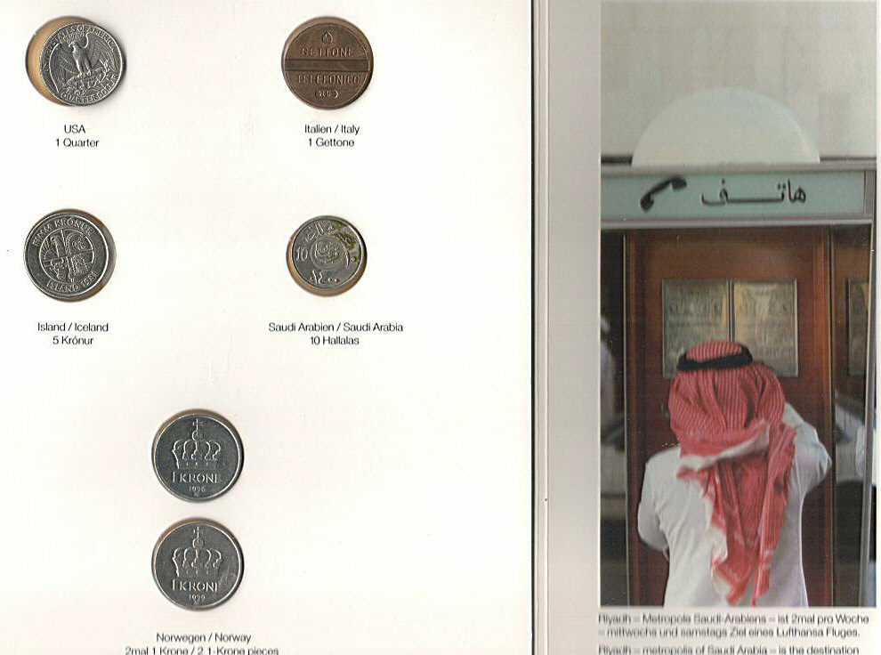 Um auch wieder einmal etwas beitragen zu können, möchte ich meine jüngste Neuerwerbung zeigen. Es handelt sich um ein Werbeartikel der Lufthansa zum Ausbau ihres Streckennetzes 1987. Das interessante daran sind die verschiedenen Telefonmünzen, die laut Klappentext in den verschiedenen Ländern verwendet werden können, ein Telefongespräch zu führen (Ich vermute für Deutschland wären das entsprechend zwei mal 10 Pfennig gewesen, damit habe ich einen Hinweis auf die damalige Grundgebühr der einzelnen Länder)