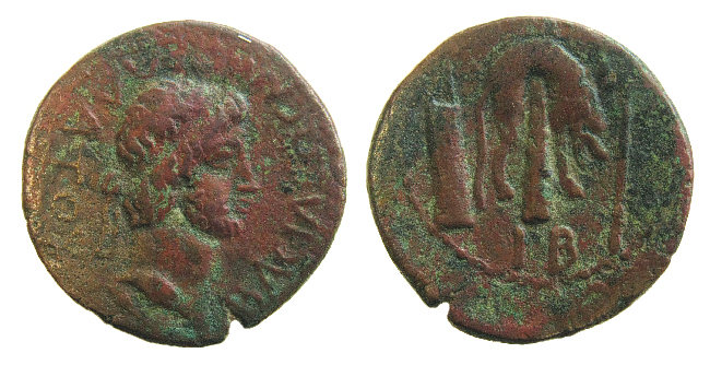 Rv.: Bärtiger Baal-Berit im langen Gewand und mit Kalathos n. l. stehend in einer Hippokampenquadriga; in der Linken hält er den Dreizack, Schale in der vorgestreckten Rechten; auf dem vordersten Hippokamp reitet ein kleiner Genius, im Felde l. Ethnikon in phönizischer Schrift und Aphlaston, rechts im Feld Monogramm.