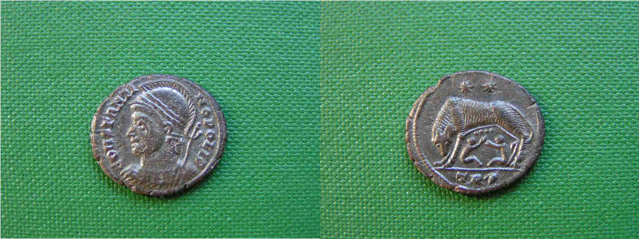 solche Stempelkopplungen sind bekannt. Man findet sie hin und wieder. Es sind wohl zeitgenössische barbarisierte Beischläge, wobei die Hersteller sowohl diese Kopplung als auch die analoge, also Constantinopolis auf der Vs. mit Wölfin auf dem Rv. produzierten. Auch der kleine Schrötling passt gut dazu. Ich habe auch ein Stück mit 13mm Durchmesser. Ich kann im Abschnitt TRS, also Trier, zweite Offizin, erkennen. Das scheint der typische Herkunftsort zu sein, da ich bis jetzt nur solche mit TR gesehen habe. Ich habe mal beide Varianten erwerben können (diese haben ca. 18mm Durchmesser):